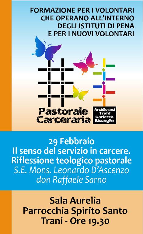 Le iscrizioni si possono fare in loco PROGRAMMA 29 febbraio Il senso del servizio in carcere. Riflessione teologico pastorale S.E. Mons. Leonardo D’Ascenzo e don Raffaele Sarno 21 marzo Ordinamento Penitenziario. Misure privative e limitative della libertà Tipologia degli Istituti, regole, organizzazione e categorie di detenuti dott. Giuseppe Altomare, Direttore del carcere di Trani 18 aprile Trattamento interno, progetti educativi dott.ssa … Continua a leggere