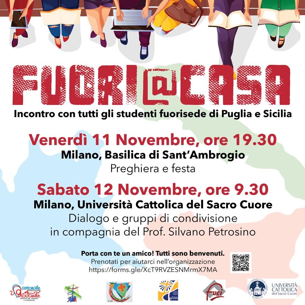 PASTORALE GIOVANILE. “FUORI@CASA” –  INCONTRO CON TUTTI I GIOVANI “FUORI SEDE” A MILANO E DINTORNI «Siamo contenti – scrivono in una comunicazione i responsabili della Pastorale Giovanile di  Puglia, Sicilia e Lombardi – di poter promuovere questa iniziativa nata dall’ascolto dei bisogni dei nostri studenti e lavoratori che, oltre a sperimentare una solitudine per il distacco dalle loro comunità di origine, cercano di creare ponte … Continua a leggere PASTORALE GIOVANILE. “FUORI@CASA” –  INCONTRO CON TUTTI I GIOVANI “FUORI SEDE” A MILANO E DINTORNI »