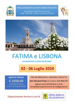 dioc. Brindisi Pellegrinaggio Diocesano Fatima – Lisbona 02- 06 Luglio 2024 23 Novembre 2023 0 31 PHOTO-2023-11-22-17-25-27 clic qui per l’articolo sul sito diocesano ARTICOLI CORRELATIALTRO DALL'AUTORE ITINERARIO CATECHISTICO DIOCESANO 2025-2026 – Arcidiocesi di Brindisi – Ostuni TRASLAZIONE E SEPOLTURA DI MONS. SETTIMIO TODISCO – Arcidiocesi di Brindisi – Ostuni CONFERMATI NELLA FEDE DA PAPA LEONE – Arcidiocesi di Brindisi – Ostuni Don Angelo Ciccarese è tornato alla casa del Padre – Arcidiocesi di Brindisi – Ostuni Apertura del processo diocesano per la beatificazione e canonizzazione del Servo di Dio Teodoro d’Amici – Arcidiocesi di Brindisi – Ostuni