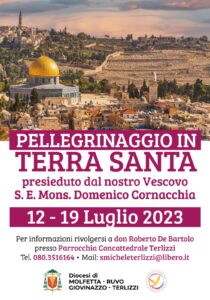 La diocesi di Molfetta-Ruvo-Giovinazzo-Terlizzi, tramite l’Ufficio diocesano per la pastorale del tempo libero, turismo, sport e pellegrinaggi, organizza dal 12 al 19 luglio 2023 (8 giorni, 7 notti) un pellegrinaggio in Terra Santa insieme al vescovo mons. Domenico Cornacchia.