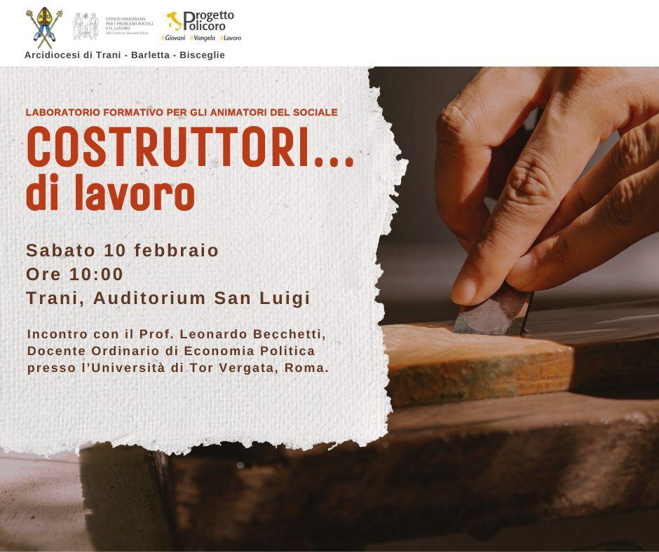 Sabato 10 febbraio 2024 , a Trani, presso l’Auditorium San Luigi, a cominciare dalle 10.00, si terrà il primo laboratorio formativo “Costruttori … di lavoro …” per gli animatori del sociale promosso dall’Ufficio diocesano Problemi Sociali e lavoro in collaboratore con il Servizio del Progetto Policoro. L’incontro sarà animato dall’intervento del prof. Leonardo Becchetti, docente ordinario de Economia Politica presso l’Università Tor Vergata, Roma. … Continua a leggere »
