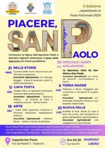 Continua con la seconda edizione l’iniziativa PIACERE, SAN PAOLO, organizzata dalla Parrocchia “Santi Pietro e Paolo” in Galatina, il Comune di Galatina e l’Associazione delle imprese galatinesi, con una serie di appuntamenti che, da maggio a luglio, sono finalizzati alla conoscenza dell’Apostolo delle genti. Un’occasione di arricchimento spirituale e culturale, rivolta sia ai turisti che ai residenti.