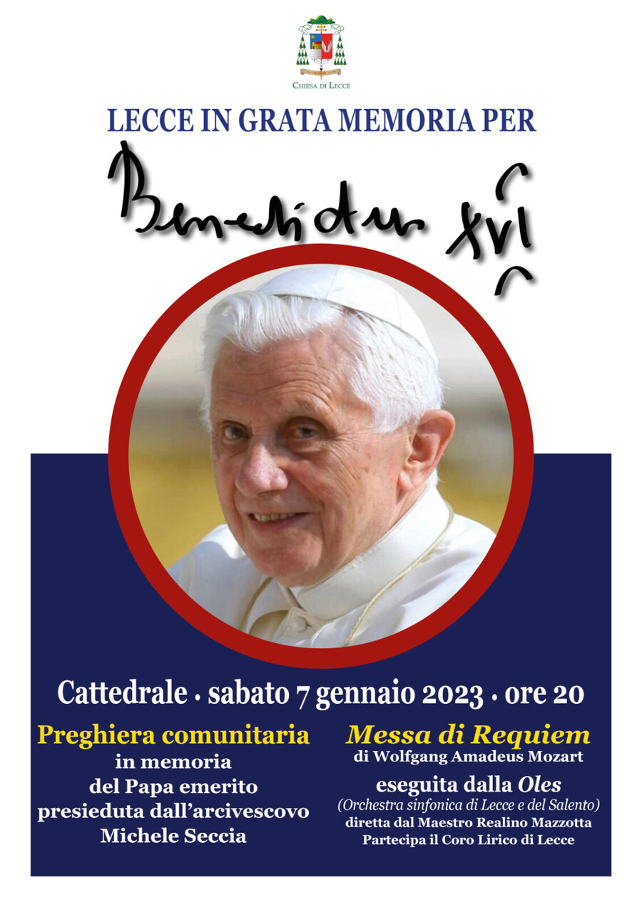 Di ritorno da Roma, sabato 7 gennaio, alle 20, l’arcivescovo presiederà in cattedrale una preghiera comunitaria in memoria del Papa emerito defunto durante il quale verrà letto il testamento spirituale di Joseph Ratzinger.
