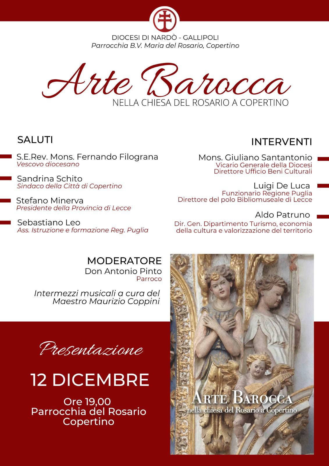 Si terrà il 12 dicembre 2022 alle ore 19, nella chiesa del Rosario di Copertino, Via Cosimo Mariano, la presentazione del volume “Arte barocca nella Chiesa del Rosario di Copertino” che illustra la scultura barocca dei due maestosi altari realizzati tra metà 600 e inizi ‘700 da Ambrogio Martinelli e Giuseppe Longo. Nel volume di Marcello Gaballo, Giovanni Greco e Alessandra Marulli, per la collana Analecta Nerito Gallipolitana, Grenzi Editore, dopo le vicende storico-artistiche dell’edificio anticamente officiato dai padri Domenicani, si illustrano anche le coeve emergenze pittoriche, tra le quali l’imponente tela della Madonna del Rosario dipinta dal celebre pittore Gian Domenico Catalano.