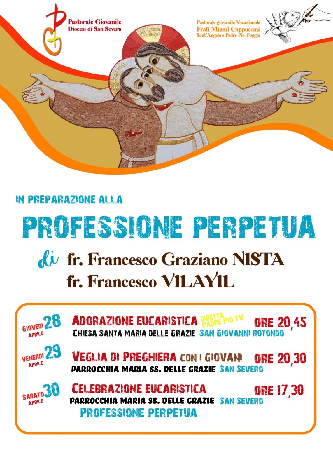 dioc. San Severo Professione perpetua di fr. Francesco Graziano NISTA e fr. Francesco VILAYIL 27 Aprile 2022 0 35 L’articolo Professione perpetua di fr. Francesco Graziano NISTA e fr. Francesco VILAYIL proviene da Diocesi di San Severo. clic qui per l’articolo sul sito della Diocesi di San Severo ARTICOLI CORRELATIALTRO DALL'AUTORE Diocesi di San Severo » parola alla Parola – DOMENICA 16/11/2025 Diocesi di San Severo » UN VOTO per COSTRUIRE SPERANZA e FRATERNITÀ Diocesi di San Severo » parola alla Parola – SABATO 15/11/2025 Diocesi di San Severo » parola alla Parola – VENERDÌ 14/11/2025 Diocesi di San Severo » parola alla Parola – MARTEDÌ 11/11/2025