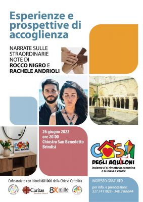 Domenica 26 giugno, alle ore 20.00, nella splendida cornice del Chiostro di San Benedetto, avrà luogo la presentazione del progetto “CASA DEGLI AQUILONI”, nato dalla collaborazione tra Caritas diocesana e associazione Migrantes Brindisi e finanziato in parte con i fondi dell’8×1000 alla Chiesa Cattolica.