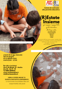 Anche per questa estate 2022 siamo pronti a riproporre la fantastica esperienza del progetto (R)Estate Insieme: attività di studio e di socializzazione, laboratori, giochi all’aperto, uscite. Uno spazio sicuro in cui i ragazzi possono sperimentare lo stare insieme.