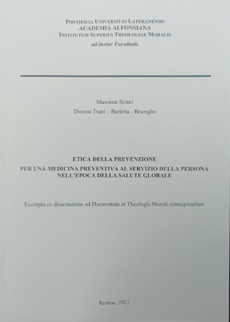 PUBBLICATA LA TESI DI DOTTORATO DI DON MASSIMO SERIO Visto il nihil obstat del Rector Magnificus Pont. Univ. Lateranensis, con il quale si è concesso a don Massimo Serio l’intera pubblicazione della tesi dottorale discussa in Teologia Morale presso l’Accademia Alfonsiana (dal titolo “Etica della prevenzione. Per una medicina preventiva al servizio della persona nell’epoca della salute globale”), è stato pubblicato di recente un estratto … Continua a leggere PUBBLICATA LA TESI DI DOTTORATO DI DON MASSIMO SERIO
