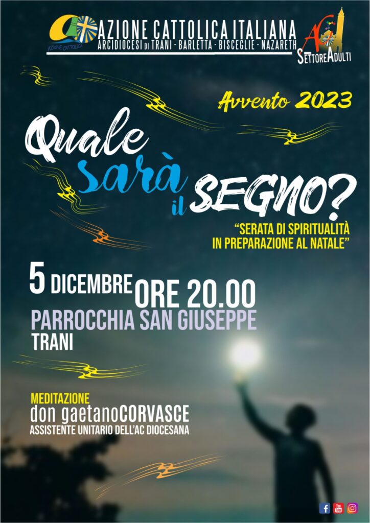 QUALE SARA’ IL SEGNO? SERATA DI SPIRITUALITA’ IN PREPARAZIONE AL NATALE SETTORE ADULTI DELL’AC DIOESANA MARTEDI’ 5 DICEMBRE 2023 – ORE 20:00 TRANI – PARROCCHIA SAN GIUSEPPE, VIA DE ROBERTIS, 71/75 Martedì 5 dicembre p.v. il Settore adulti dell’Ac diocesana propone una serata di spiritualità in Tempo di Avvento presso la parrocchia San Giuseppe a Trani, intitolata “Quale sarà il segno?”. Durante la serata … Continua a leggere