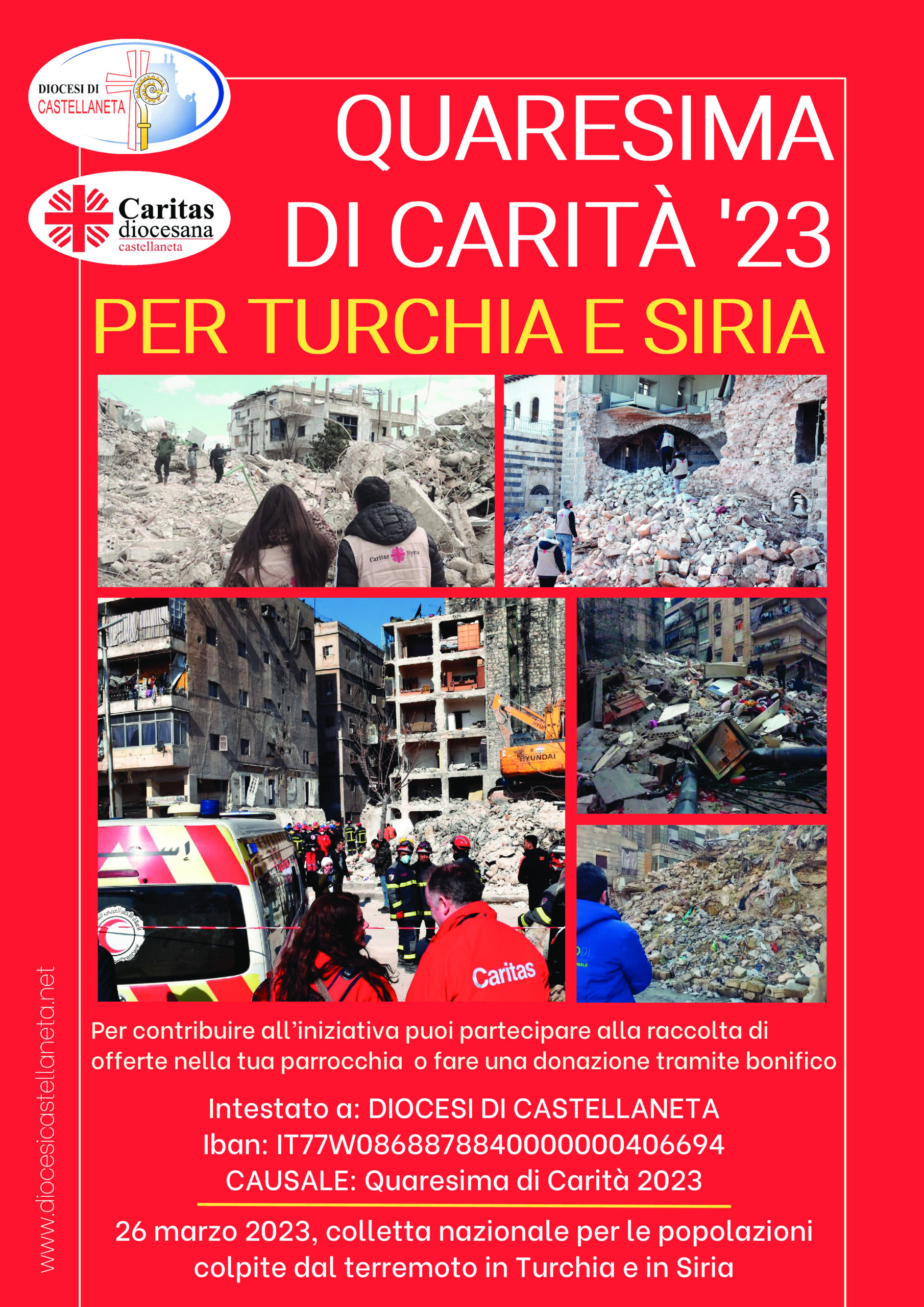 Anche la nostra diocesi partecipa alla colletta nazionale indetta dalla Conferenza Episcopale Italiana a favore delle popolazioni colpite dal terremoto in Turchia e Siria e, inoltre, dedica a questa finalità la annuale iniziativa della Quaresima di Carità.