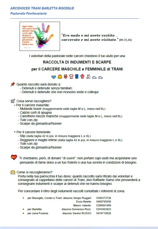 RACCOLTA DI INDUMENTI E SCARPE PER IL CARCERE MASCHILE E FEMMINILE DI TRANI I volontari della pastorale nelle carceri chiedono il tuo aiuto per una “Raccolta di indumenti e scarpe per il Carcere Maschile e Femminile di Trani. Quanto raccolto sarà donato a: – Detenuti e detenute senza familiari; – Detenuti e detenute che non ricevono visite e colloqui. Cosa serve raccogliere? Per il carcere … Continua a leggere