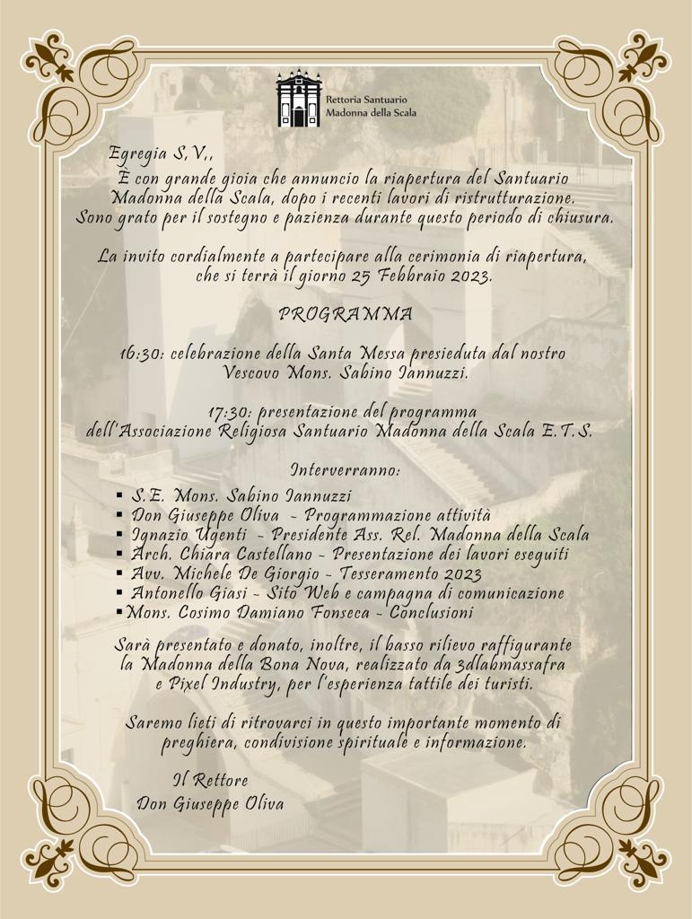 Sabato 25 Febbraio 2023 riapre al culto, dopo i recenti lavori di ristrutturazione, il Santuario della Madonna della Scala di Massafra.