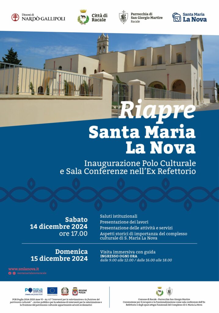 “La riapertura di Santa Maria La Nova, testimonianza di fede, di storia e di arte” afferma il Parroco, Don Pasquale Fabbiano, “rappresenta certamente un traguardo fondamentale ma è anche una grande sfida e una opportunità, per la Parrocchia in primis ma direi per l’intera comunità racalina, per aprirsi al territorio e di crescere in consapevolezza e identità, sul piano culturale, dell’inclusione e dell’aggregazione sociale”.