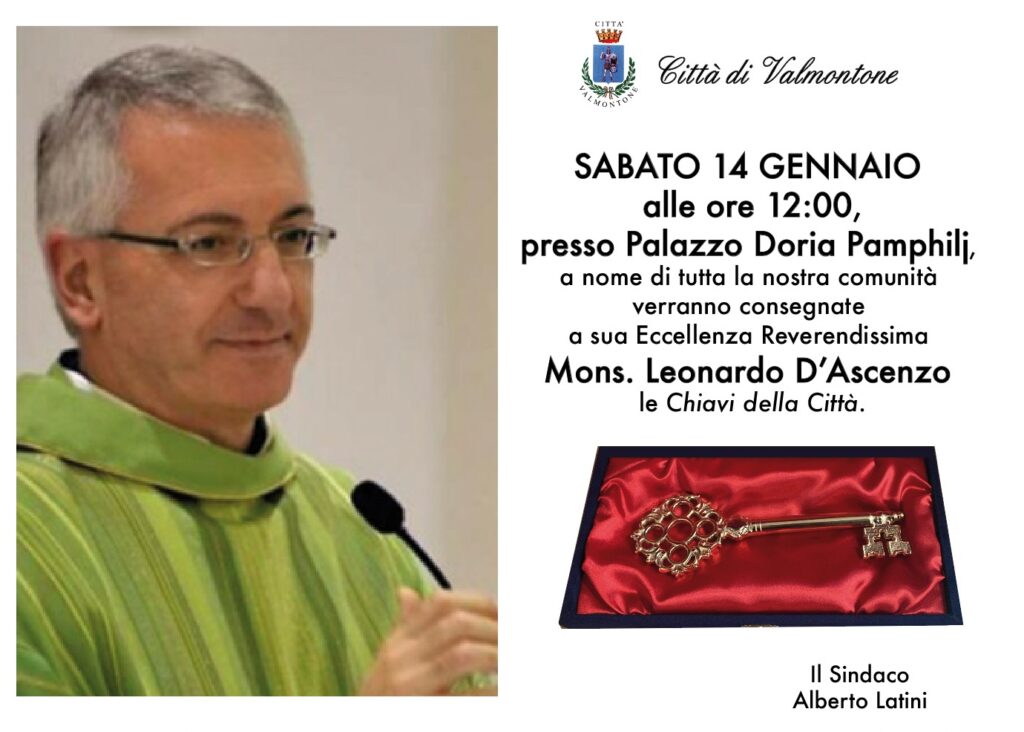 RICONOSCIMENTO ALL’ARCIVESCOVO. SABATO 14 A LUI LA CONSEGNA DELLE CHIAVI DELLA CITTA’ DI VALMONTONE La cerimonia nella Città natale alle ore 12.00, presso Palazzo Doria Pamphilj, nel giorno del suo quinto anniversario dell’ordinazione episcopale «Sabato 14 gennaio – si legge in un comunicato a firma del Sindaco di Valmontone Alberto Latini – alle ore 12.00, presso Palazzo Doria Pamphilj, a nome di tutta la nostra … Continua a leggere RICONOSCIMENTO ALL’ARCIVESCOVO. SABATO 14 A LUI LA CONSEGNA DELLE CHIAVI DELLA CITTA’ DI VALMONTONE