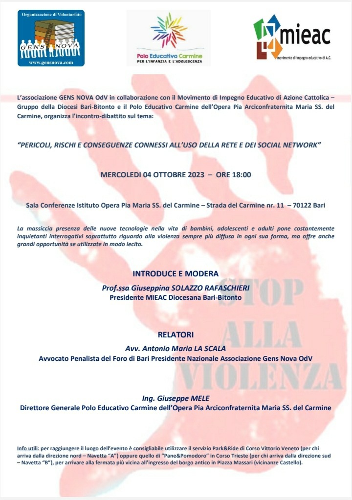 L’ Associazione GENS NOVA O.d.V., in collaborazione con il Movimento di Impegno Educativo di A.C. e il Polo Educativo dell’Opera Pia Arciconfraternita Maria S.S. del Carmine, organizza l’Incontro-Dibattito sul tema Rischi, pericoli, conseguenze connessi all’uso della rete e dei Social Network, mercoledì 4 ottobre 2023, alle ore 18.00, presso la Sala Conferenze dell’Istituto Opera Pia Maria S.S. del Carmine (Strada del Carmine n. 11).
