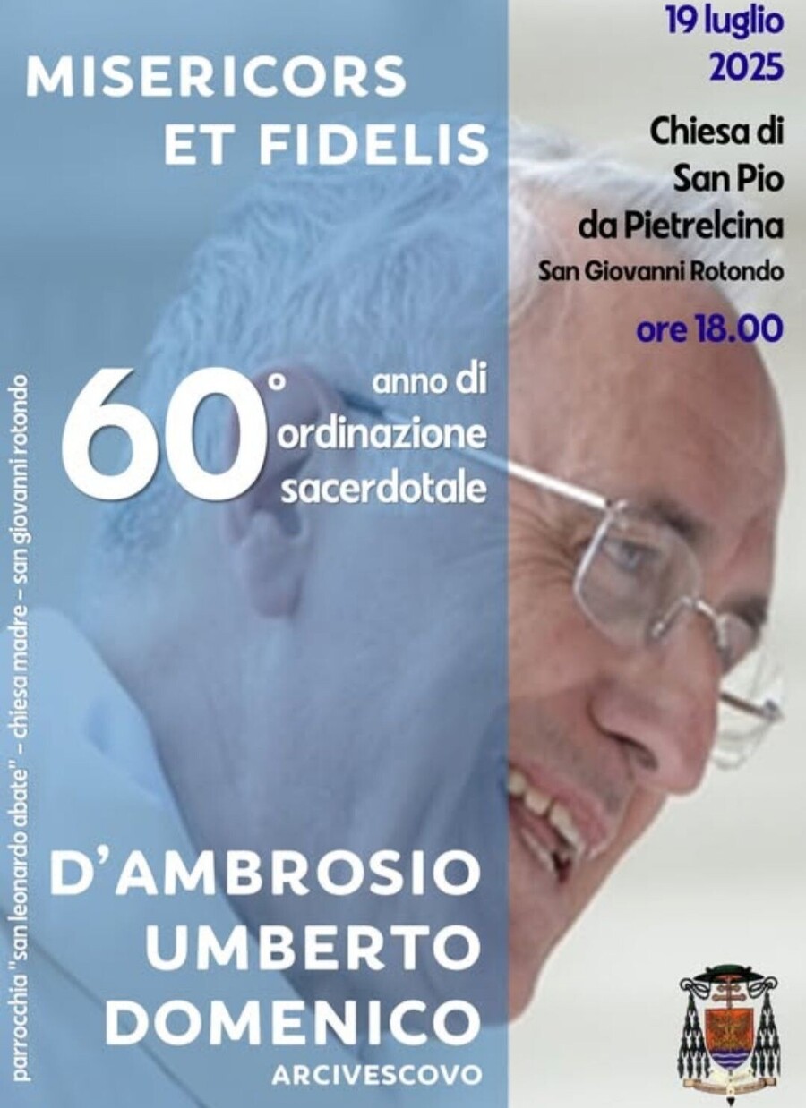 La Chiesa di Lecce tutta, insieme al suo pastore l’arcivescovo Angelo Raffaele Panzetta, si unisce alla gioia di mons. Domenico Umberto D’Ambrosio che il prossimo 19 luglio ringrazierà il Sommo ed Eterno Sacerdote, Cristo Gesù, per i sessant’anni di vita presbiterale.