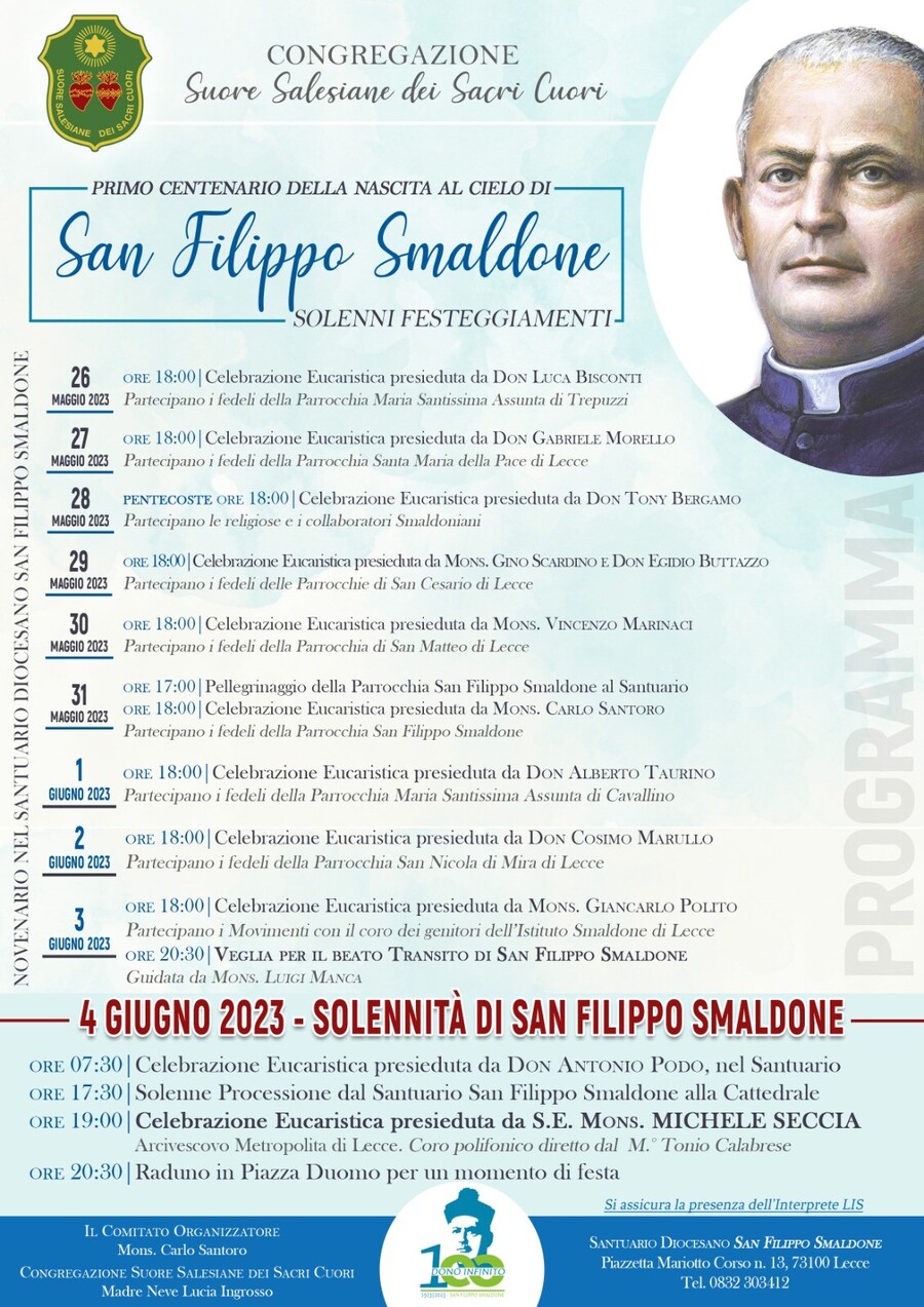 Il 3 giugno, alla vigilia della festa, alle 18 la messa celebrata da mons. Giancarlo Polito con i movimenti e il coro dell’Istituto Smaldone di Lecce. E alle 20:30 la veglia per il beato transito di San Filippo Smaldone guidata da mons. Luigi Manca, vicario generale della diocesi.