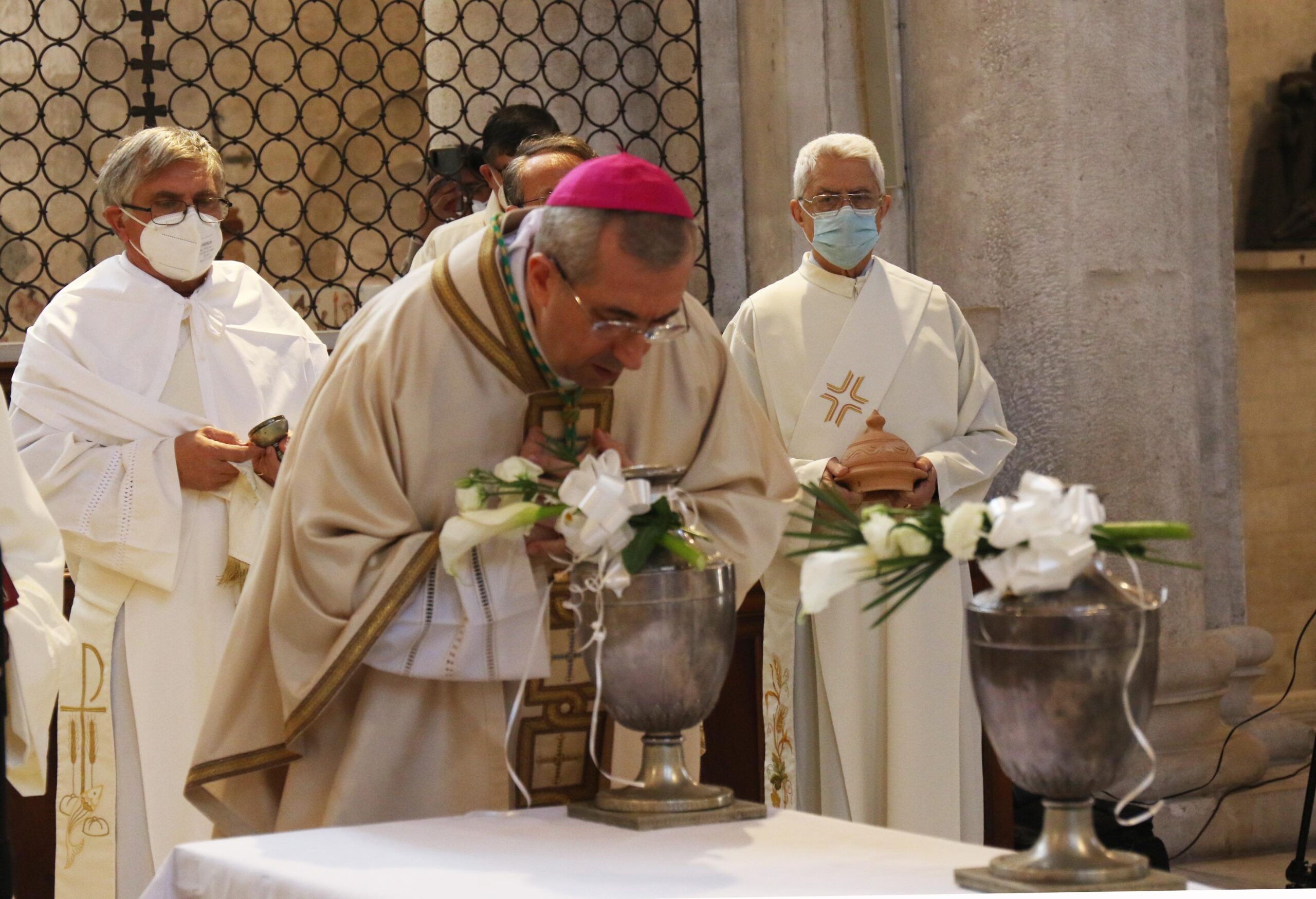 Nella Messa crismale del Giovedì Santo gli oli santi stanno al centro dell’azione liturgica. Vengono consacrati nella cattedrale dal Vescovo per tutto l’anno. Esprimono così anche l’unità della Chiesa, garantita dall’Episcopato, e rimandano a Cristo, il vero “pastore e custode delle nostre anime”, come lo chiama san Pietro (cfr 1 Pt 2,25). E, al contempo, tengono insieme tutto l’anno liturgico, ancorato al mistero del Giovedì Santo. Infine, rimandano all’Orto degli Ulivi, in cui Gesù ha accettato interiormente la sua Passione. L’Orto degli Ulivi è però anche il luogo dal quale Egli è asceso al Padre, è quindi il luogo della Redenzione: Dio non ha lasciato Gesù nella morte. Gesù vive per sempre presso il Padre, e proprio per questo è onnipresente, sempre presso di noi. Questo duplice mistero del Monte degli Ulivi è anche sempre “attivo” nell’olio sacramentale della Chiesa. In quattro Sacramenti l’olio è segno della bontà di Dio che ci tocca: nel Battesimo, nella Cresima come Sacramento dello Spirito Santo, nei vari gradi del Sacramento dell’Ordine e, infine, nell’Unzione degli infermi, in cui l’olio ci viene offerto, per così dire, quale medicina di Dio – come la medicina che ora ci rende certi della sua bontà, ci deve rafforzare e consolare, ma che, allo stesso tempo, al di là del momento della malattia, rimanda alla guarigione definitiva, alla risurrezione (cfr Gc 5,14). Così l’olio, nelle sue diverse forme, ci accompagna lungo tutta la vita: a cominciare dal catecumenato e dal Battesimo fino al momento in cui ci prepariamo all’incontro con il Dio Giudice e Salvatore. Infine, la Messa crismale, in cui il segno sacramentale dell’olio ci viene presentato come linguaggio della creazione di Dio, si rivolge, in modo particolare, a noi sacerdoti: essa ci parla di Cristo, che Dio ha unto Re e Sacerdote – di Lui che ci rende partecipi del suo sacerdozio, della sua “unzione”, nella nostra Ordinazione sacerdotale.