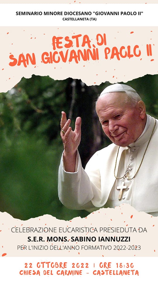 Sabato 22 Ottobre 2022, Festa liturgica di San Giovanni Paolo II, alle ore 18.30 presso la Chiesa del Centro Pastorale “Lumen Gentium” di Castellaneta, Mons. Sabino Iannuzzi presiederà la Santa Messa per l’inizio dell’anno formativo 2022-2023 del Seminario minore diocesano “Giovanni Paolo II”.
