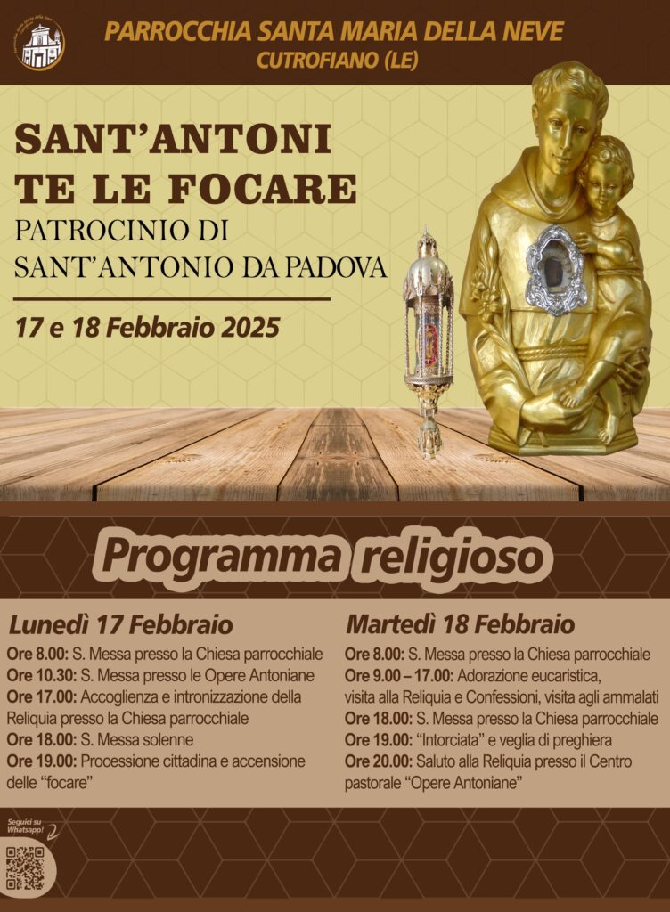 E anche quest’anno, seppur per un periodo più limitato, le Reliquie del Santo ritorneranno nella comunità parrocchiale di Cutrofiano secondo gli appuntamenti celebrativi indicati nella locandina.