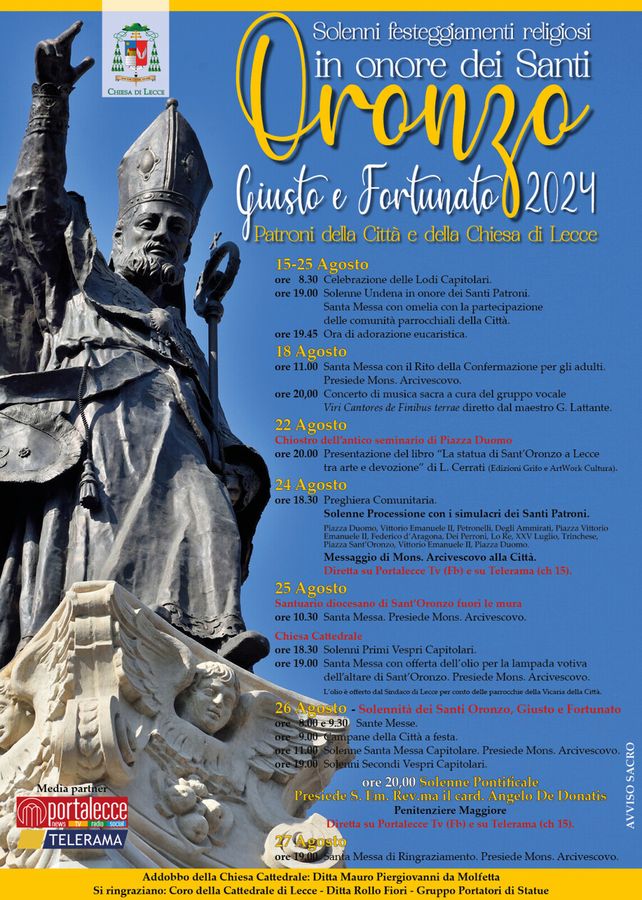 È fuori di dubbio che gli eventi sacri centrali e più attesi dalla città e dalla comunità cristiana, siano la processione con i simulacri dei tre santi del 24 agosto alle 18,30 con il Messaggio dell’arcivescovo alla città e il solenne pontificale del 26 agosto, spostato alle 20 di sera per facilitare la partecipazione di chi vuole difendersi dal caldo agostano. Entrambi gli appuntamenti religiosi saranno trasmessi in diretta esclusiva sul web da Portalecce tv (pagina Facebook) e in tv da Telerama (ch 15).