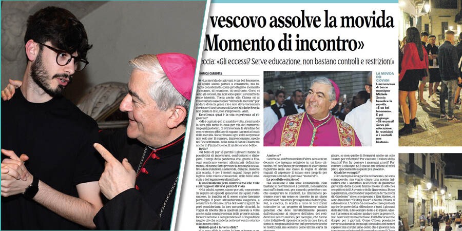 Sono le prime parole con cui l’arcivescovo Michele Seccia ha risposto alle domande di Monica Carbotta e che sono apparse ieri in una lunga intervista (SOTTO IL TESTO INTEGRALE) apparsa sull’edizione domenicale de La Gazzetta del Mezzogiorno, edizione Salento. “Sono rimasto ogni volta sorpreso – prosegue Seccia – e non solo per il numero, impressionante, specie nel fine settimana, nella zona di Santa Chiara ma anche in Piazza Duomo”.