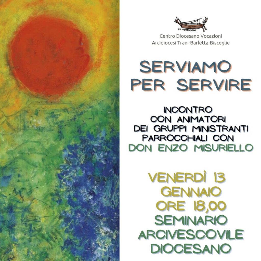 Dal CENTRO DIOCESANO VOCAZIONI, secondo incontro per animatori dei gruppi ministranti in vista della Giornata Diocesana del Ministrante. Ci vediamo venerdì 13 gennaio ore 18 presso il Seminario Arcivescovile Diocesano in via Seminario, 42 – Bisceglie