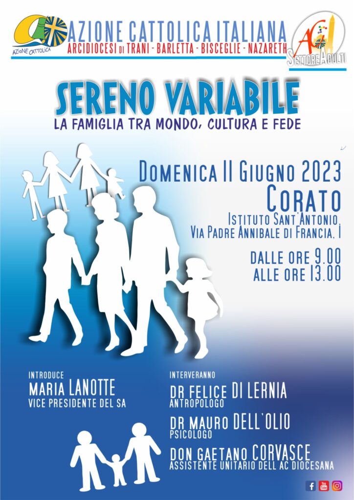 SERENO VARIABILE: LA FAMIGLIA TRA MONDO, CULTURA E FEDE Domenica 11 giugno 2023 – dalle ore 9:00 alle ore 13:00 Corato, Istituto Sant’Antonio, Via Padre Annibale di Francia, 1 Il Settore Adulti dell’Azione (SA) Cattolica diocesana ha il piacere di comunicare che domenica 11 giugno 2023 organizza un’iniziativa dal titolo: “Sereno variabile: la famiglia tra mondo, cultura e fede”. L’incontro si terrà presso l’Istituto … Continua a leggere SERENO VARIABILE: LA FAMIGLIA TRA MONDO, CULTURA E FEDE