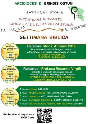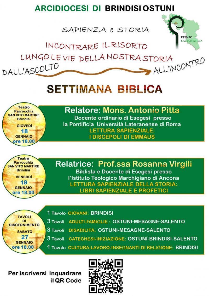 dioc. Brindisi Settimana Biblica – Arcidiocesi di Brindisi – Ostuni 30 Novembre 2023 0 29 Sapienza e storia – Incontrare il Risorto lungo le vie della nostra storia – dall’ascolto all’incontro Link per le iscrizioni https://forms.gle/66C3qJdEBn9hjyBc6 clic qui per l’articolo sul sito diocesano ARTICOLI CORRELATIALTRO DALL'AUTORE ITINERARIO CATECHISTICO DIOCESANO 2025-2026 – Arcidiocesi di Brindisi – Ostuni TRASLAZIONE E SEPOLTURA DI MONS. SETTIMIO TODISCO – Arcidiocesi di Brindisi – Ostuni CONFERMATI NELLA FEDE DA PAPA LEONE – Arcidiocesi di Brindisi – Ostuni Don Angelo Ciccarese è tornato alla casa del Padre – Arcidiocesi di Brindisi – Ostuni Apertura del processo diocesano per la beatificazione e canonizzazione del Servo di Dio Teodoro d’Amici – Arcidiocesi di Brindisi – Ostuni