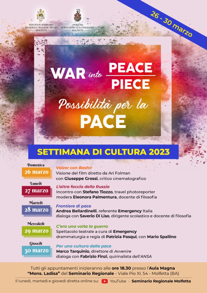 Anche quest’anno il Seminario Regionale Pugliese “Pio XI” e l’ Ente “Opera Pia Monte di Pietà e Confidenze – Molfetta” ripropongono il tradizionale appuntamento della Settimana di cultura, che si svolgerà̀ dal 26 al 30 marzo prossimi. Ancora una volta la collaborazione di queste due istituzioni, l’una impegnata nella formazione dei futuri presbiteri, l’altra di natura laicale impegnata nella promozione di una “cultura cristiana” nella società, mette in rilievo la vivacità di una Chiesa capace di proporre percorsi significativi per il territorio.