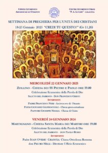 In occasione della Settimana di preghiera per l’unità dei cristiani, nella nostra Arcidiocesi sono programmate due Celebrazioni Ecumeniche a cura dell’Ufficio Ecumenico e del Centro Ecumenico Oikos “P.A. Lundin” di Galatina. Mercoledì 22 gennaio a Zollino, nella Chiesa dei SS. Pietro e Paolo alle ore 19:00, a cui parteciperà Mons. Francesco Neri; e venerdì 24 gennaio a Martignano, nella Chiesa Santa Maria dei Martiri, sempre alle ore 19:00.
