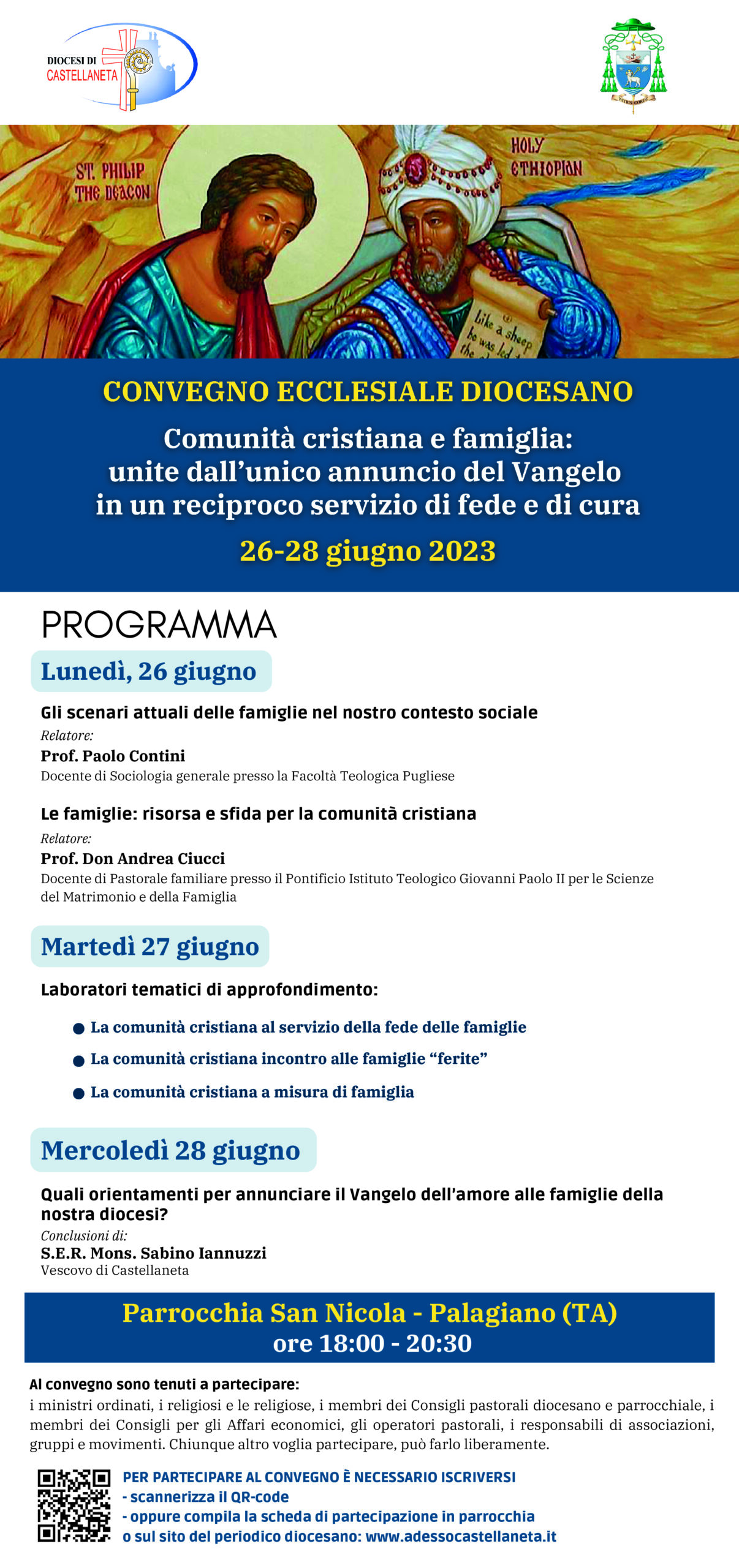 Il secondo giorno del convegno sarà dedicato ai Laboratori tematici di approfondimento – per questo motivo è importante iscriversi al Convegno attraverso il sito del periodico della Diocesi https://www.adessocastellaneta.it/7392-2/ al seguente link https://docs.google.com/forms/d/e/1FAIpQLSfjWQEn49h6UmmXWRznBS31G76QMI5A8aYh78p19gYgiYI5Ow/viewform