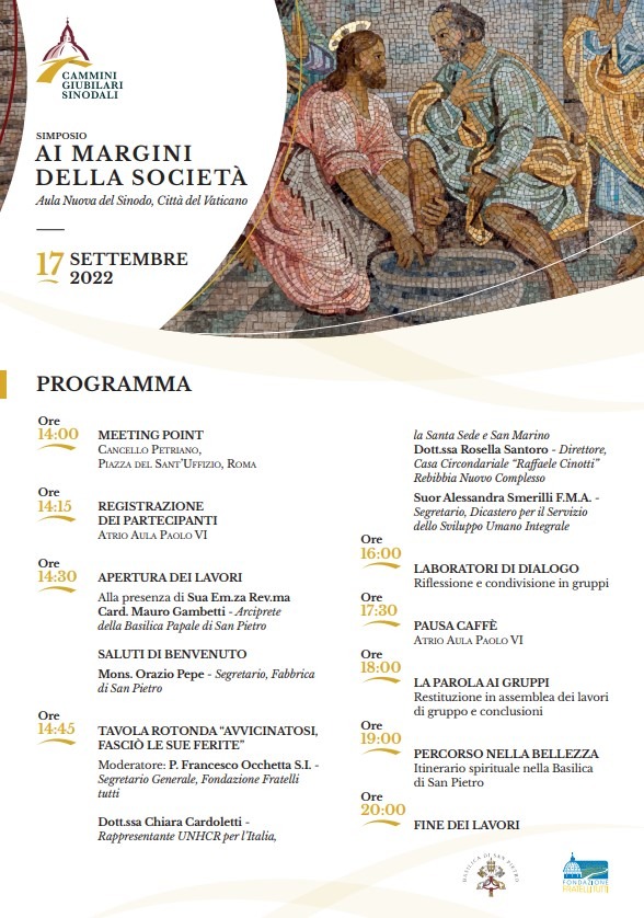 Quest’oggi il cappellano degli Istituti Penitenziari di Trani, don Raffaele Sarno insieme ai diaconi don Sergio Ruggieri e don Mimmo Rizzi, su invito del Vicariato della Città del Vaticano, parteciperanno al Simposio “Ai margini della società”, che si terrà nel pomeriggio, a partire dalle ore 14.00 presso l’Aula Nuova del Sinodo in Vaticano. L’incontro rappresenta il secondo momento del cammino attraverso il quale la Basilica … Continua a leggere SIMPOSIO VATICANO SUL TEMA “AI MARGINI DELLA SOCIETA’” – LA PARTECIPAZIONE DI UNA DELEGAZIONE DIOCESANA