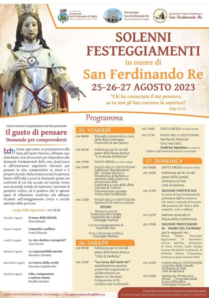 dioc. Trani SOLENNI FESTEGGIAMENTI IN ONORE DI SAN FERDINANDO RE — 25-26-27 AGOSTO 2023 23 Agosto 2023 0 29 clic qui per l’articolo sul sito della Diocesi di Trani-Bisceglie-Barletta ARTICOLI CORRELATIALTRO DALL'AUTORE GIORNATA PRO ORANTIBUS – MONASTERO SAN RUGGIERO INCONTRO DI CLERO ZONA PASTORALE TRANI “SAN NICOLA PELLEGRINO” Giovedì 20 novembre 2025 PDF: I CONTENUTI DEL PRIMO INCONTRO – Prof. Pier Cesare RIVOLTELLA Prof. Pier Cesare RIVOLTELLA – PRIMA SESSIONE INCONTRO DIOCESANO A CORATO UN INCONTRO SULLA LIBERTA’ DI STAMPA – Un diritto da conoscere, difendere e onorare – Per giornalisti e per l’intero pubblico
