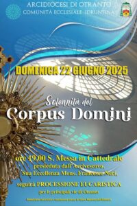 Domenica prossima, 22 giugno, celebreremo la solennità del Corpus Domini. Mons. Francesco Neri presiederà la Santa Messa nella Basilica Cattedrale di Otranto, alle ore 19.00, alla quale seguirà la Processione Eucaristica.