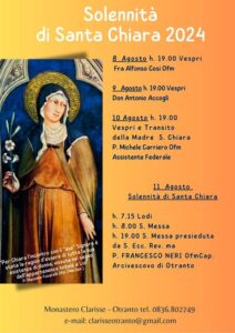 L’11 luglio la Chiesa festeggia Santa Chiara e anche le Clarisse del Monastero di Otranto propongono il seguente programma:8 agosto