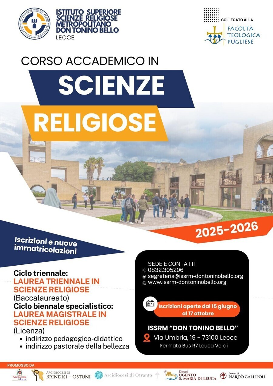 Che si voglia crescere nella propria formazione personale, prepararsi a insegnare religione cattolica o rafforzare il personale servizio nella Chiesa, l’Issrm di Lecce, collegato accademicamente alla Facoltà teologica pugliese, offre un percorso universitario che unisce serietà accademica e cura della persona.