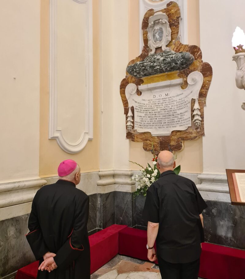 [Mons. Vescovo prega sulla tomba del Servo di Dio Emilio Giacomo Cavalieri, nella Concattedrale di Troia]