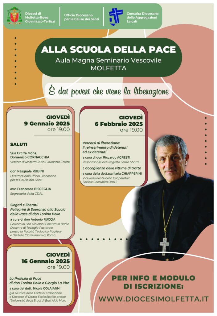 L’Ufficio Diocesano per le Cause dei Santi e la Consulta Diocesana delle Aggregazioni Laicali hanno promosso al terza edizione de Alla Scuola della Pace presso l’Aula Magna del Seminario Vescovile di Molfetta giovedì 9 gennaio, 16 gennaio e 6 febbraio 2025 alle ore 19.00.