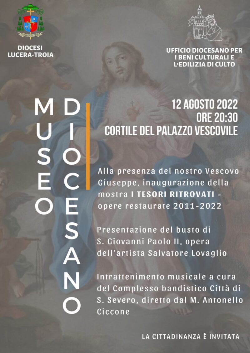 Sarà inaugurata venerdì 12 agosto prossimo, alle ore 20.30, la mostra “I Tesori ritrovati”, presso il Cortile del Palazzo Vescovile di Lucera. L’appuntamento, presieduto da S.E. il Vescovo, è organizzato dall’Ufficio diocesano per i Beni Culturali e l’Edilizia di culto, diretto da mons. Luigi Tommasone, che metterà in mostra tutte le opere artistiche restaurate nel decennio 2011-2022.