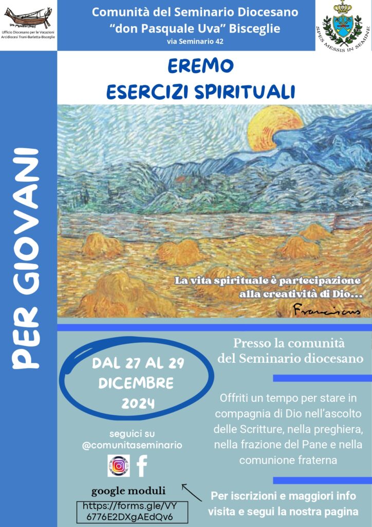 EREMO Cos’è? Vuole essere una proposta di esercizi spirituali per giovani dai 18 ai 35 anni che intendono vivere un tempo di ascolto della Parola, di preghiera e di condivisione fraterna. Quando? Da venerdì 27 (arrivi alle 9,00) a domenica 29 dicembre (pranzo compreso) presso il nostro Seminario diocesano “d. Pasquale Uva” in Bisceglie (Via Seminario, 42). Per info? Puoi contattare direttamente don Davide Abascià … Continua a leggere