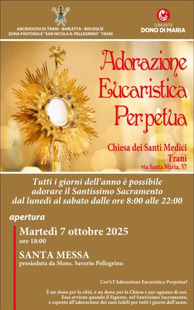 dioc. Trani TRANI. ADORAZIONE EUCARISTICA PERPETUA 22 Settembre 2025 0 14 clic qui per l’articolo sul sito della Diocesi di Trani-Bisceglie-Barletta ARTICOLI CORRELATIALTRO DALL'AUTORE GIORNATA PRO ORANTIBUS – MONASTERO SAN RUGGIERO INCONTRO DI CLERO ZONA PASTORALE TRANI “SAN NICOLA PELLEGRINO” Giovedì 20 novembre 2025 PDF: I CONTENUTI DEL PRIMO INCONTRO – Prof. Pier Cesare RIVOLTELLA Prof. Pier Cesare RIVOLTELLA – PRIMA SESSIONE INCONTRO DIOCESANO A CORATO UN INCONTRO SULLA LIBERTA’ DI STAMPA – Un diritto da conoscere, difendere e onorare – Per giornalisti e per l’intero pubblico