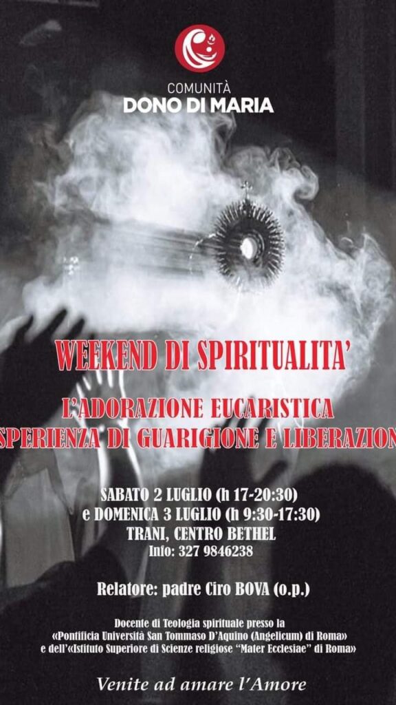 TRANI. AL CENTRO BETHEL WEEKEND DI SPIRITUALITA’ La Comunità Dono di Maria organizza per i giorni 2 e 3 luglio presso il Centro Bethel, sito a Trani in piazza Plebiscito 16/a, un “weekend di spiritualità” dal titolo “L’adorazione eucaristica come esperienza di guarigione e liberazione” Relatore: padre Ciro Bova, Docente di Teologia spirituale presso la «Pontificia Università San Tommaso D’Aquino (Angelicum) di Roma» e dell’«Istituto Superiore … Continua a leggere TRANI. AL CENTRO BETHEL WEEKEND DI SPIRITUALITA’ »