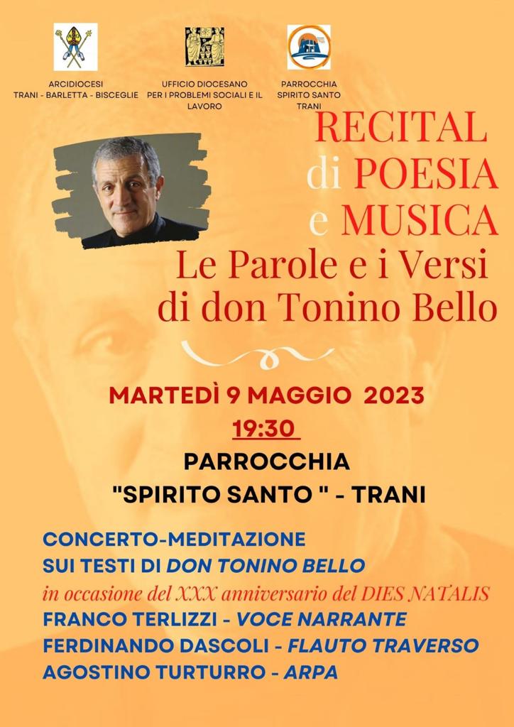 TRANI. CONCERTO MEDITAZIONE DEDICATO A DON TONINO BELLO Martedì 9 maggio 2023, a Trani, nella parrocchia Spirito Santo, alle ore 19.30, si terrà il recital di poesia e musica “Le Parola e i Versi di don Tonino Bello”. Si tratta di un concerto-meditazione sui testi di Don Tonino Bello in occasione del XXX anniversario del XXX anniversario del dies natalis. Con: Franco Terlizzi, Voce narrante … Continua a leggere TRANI. CONCERTO MEDITAZIONE DEDICATO A DON TONINO BELLO