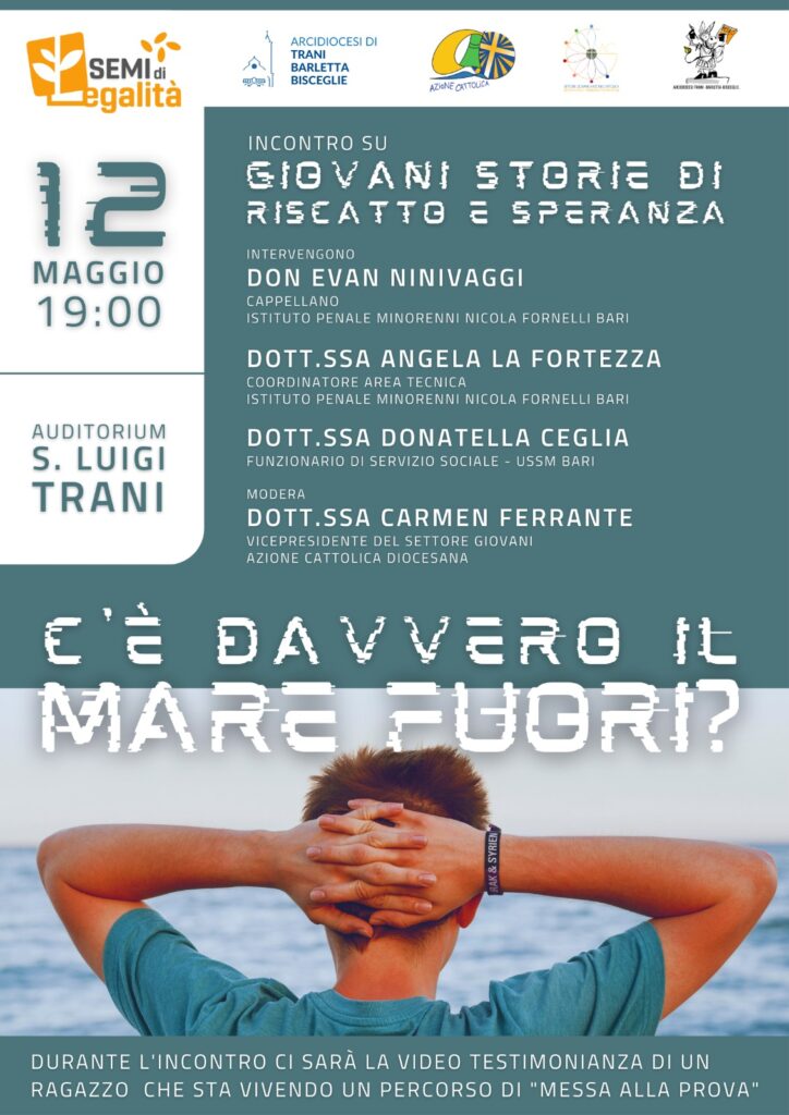 TRANI. CONVEGNO SU “GIOVANI STORIE DI LEGALITA’, RISCATTO E SPERANZA” Proseguono gli incontri del progetto “Semi di legalità” organizzato dal Settore Giovani dell’Azione Cattolica diocesana. Il prossimo appuntamento in agenda, dal titolo “C’è davvero il mare fuori? Giovani storie di legalità, riscatto e speranza”, si svolgerà venerdì 12 maggio alle ore 19 presso la chiesa di san Luigi di Trani. Il cuore della discussione sarà … Continua a leggere TRANI. CONVEGNO SU “GIOVANI STORIE DI LEGALITA’, RISCATTO E SPERANZA”