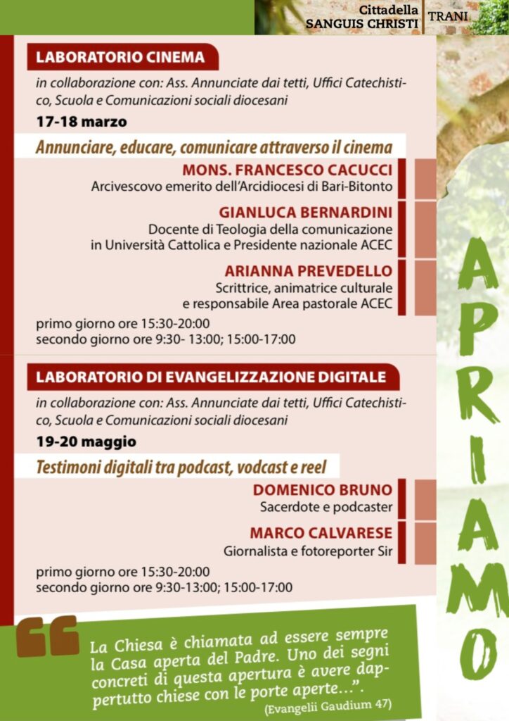 TRANI, DUE LABORATORI SU CINEMA E DIGITALE La Cittadella Sanguis Chirsti (Trani, Via Arno 2) – in collaborazione con l’Associazione Annunciate dai tetti, Ufficio diocesani Catechistico, Scuola, Cultura e comunicazioni sociali – promuove due laboratori di formazione: 17-18 MARZO 2023 Annunciare, educare, comunicare attraverso il cinema Francesco Cacucci, Arcivescovo emerito dell’Arcidiocesi di Bari-Bitonto Gianluca Bernardini, Docente di teologia della comunicazione in Università Cattolica e … Continua a leggere TRANI, DUE LABORATORI SU CINEMA E DIGITALE
