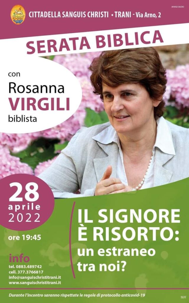 TRANI. INCONTRO CON LA BIBLISTA ROSANNA VIRGILI ALLA CITTADELLA SANGUIS CHRISTI Parlerà sul tema “Il Signore è risorto: Un estraneo tra noi?”