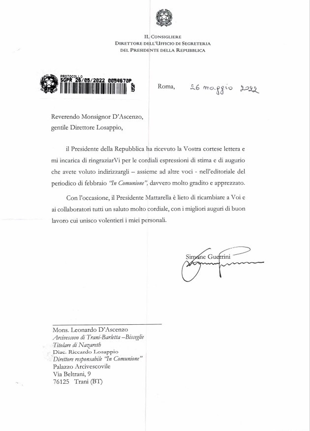 TRANI. LA PRESIDENZA DELLA REPUBBLICA RISPONDE «Tutto è nato, all’indomani della elezione, per la seconda volta, di Sergio Mattarella a Presidente della Repubblica il 29 gennaio 2022. Nella redazione di In Comunione, il mensile ufficiale dell’Arcidiocesi di Trani-Barletta-Bisceglie, venne fuori l’idea di dedicare al Capo dello Stato, quale segno di gratitudine e stima, l’editoriale del numero di febbraio con una modalità non molto usuale, a … Continua a leggere TRANI. LA PRESIDENZA DELLA REPUBBLICA RISPONDE