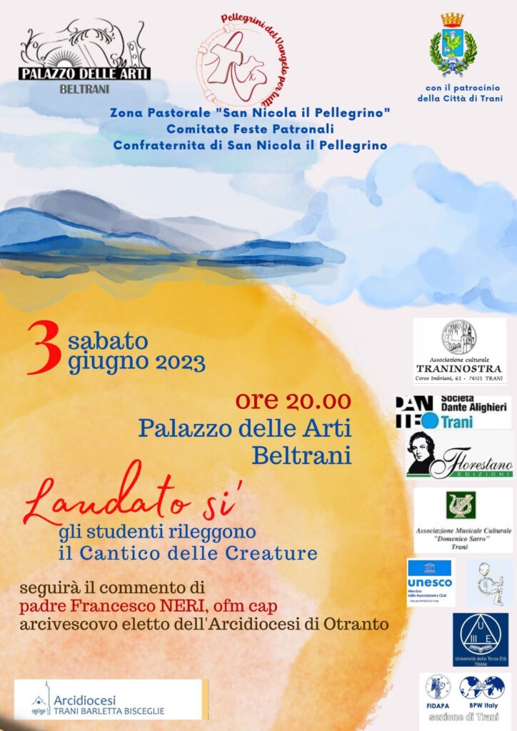 TRANI. LAUDATO SI’. GLI STUDENTI RILEGGONO IL CANTICO DELLE CREATURE All’interno delle iniziative in preparazione all’accoglienza delle reliquie di San Francesco dal 27 al 30 luglio nella nostra Città, per addentraci nello spirito del santo di Assisi, il Comitato Feste Patronali e la Zona Pastorale di Trani, in collaborazione con alcune associazioni culturali del territorio, propongono una serata dal titolo “Laudato si’”. è una serata … Continua a leggere TRANI. LAUDATO SI’. GLI STUDENTI RILEGGONO IL CANTICO DELLE CREATURE