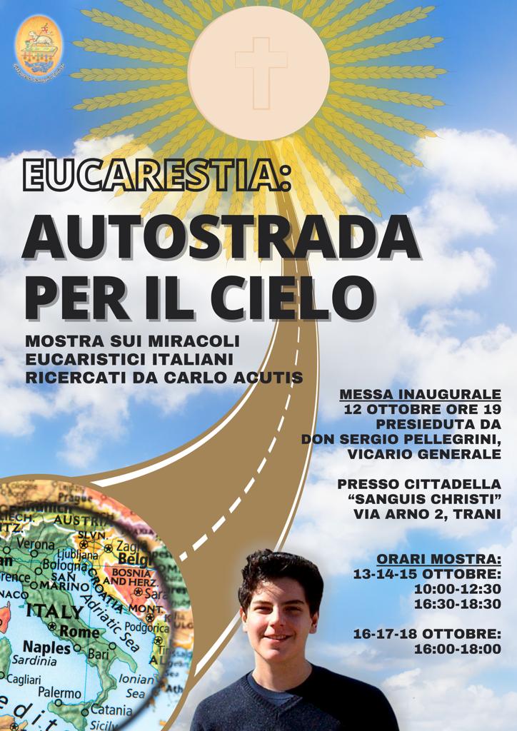 A Trani, presso la Cittadella Sanguis Christi, è in via di svolgimento la mostra sui miracoli eucaristica ricercati dal beato Carlo Acutis dal titolo “Eucarestia: Autostrada per il Cielo”. L’inaugurazione della mostra è avvenuta il 12 ottobre, memoria liturgica del beato al termine di una celebrazione eucaristica presieduta da don Sergio Pellegrini, Vicario Generale La grafica e le didascalie sono a cura delle Suore … Continua a leggere TRANI. MOSTRA SUI MIRACOLI EUCARISTICI ITALIANI RICERCATI DA CARLO ACUTIS